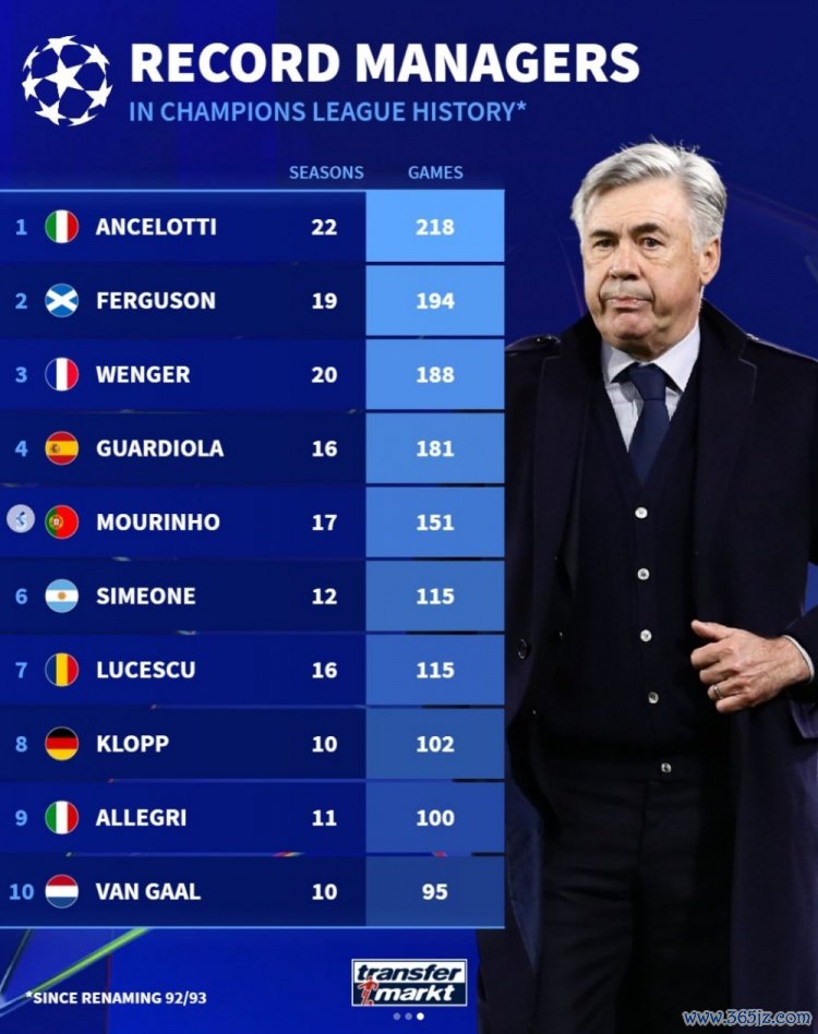 德转列欧冠握教场次名次:安切洛蒂218场居首,弗格森温格二三位