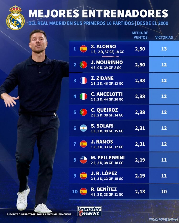10月10日讯 德国转会商场统计了2000年以来皇马主帅前16场比赛的得手场次,比肩出榜单,阿隆索13胜居首,穆里尼奥、皆达内、安切洛蒂12胜。
