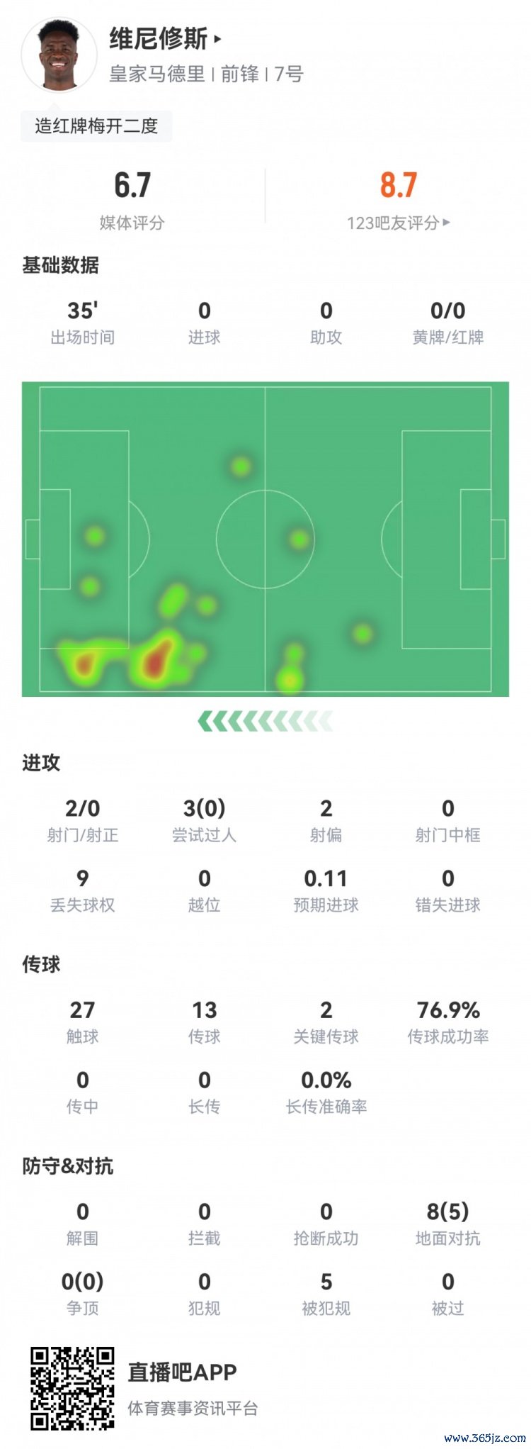 维尼修斯数据:替补35分钟5次被犯规造两红,2次关节传球评分6.7