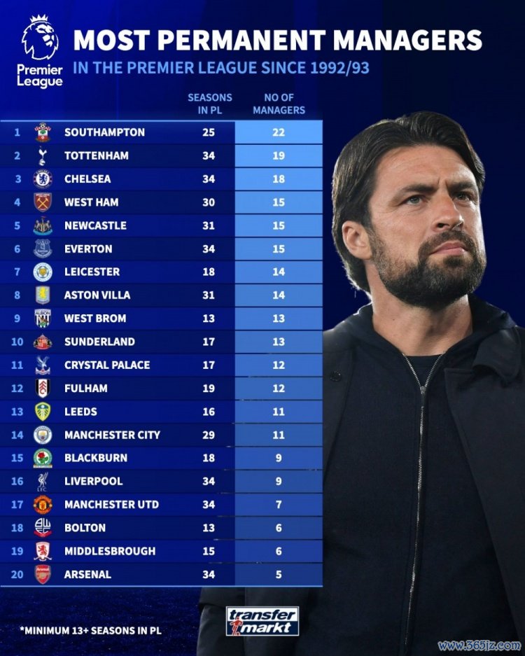 英超历史致密主帅换帅榜:热刺19次、切尔西18次 阿森纳仅5次最少