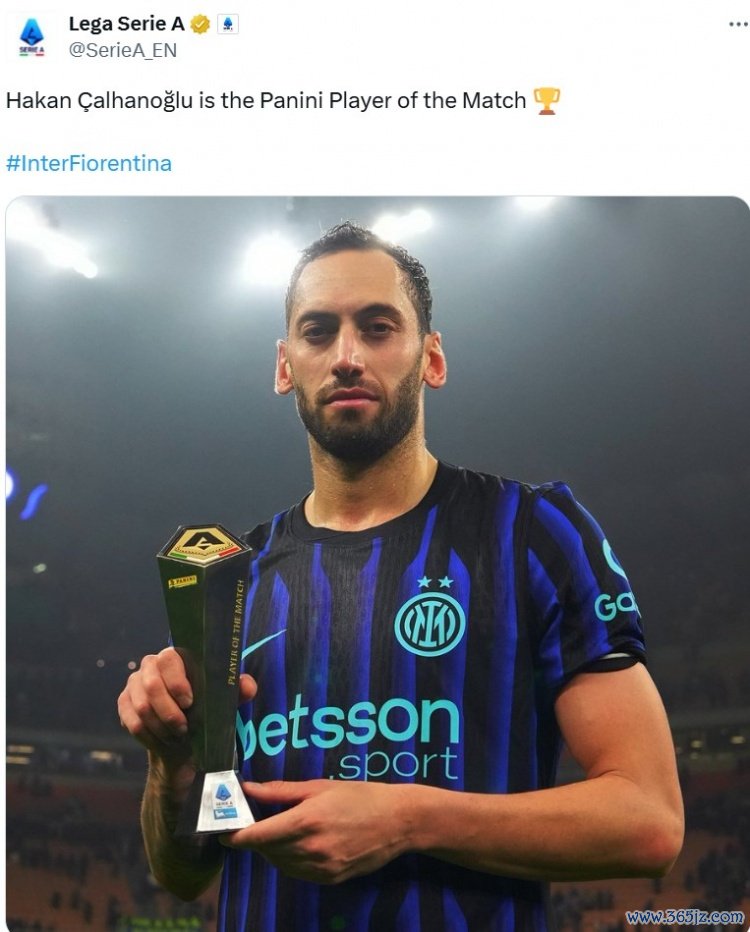 梅开二度!官方:恰尔汗奥卢当选国米3-0佛罗伦萨全场最好