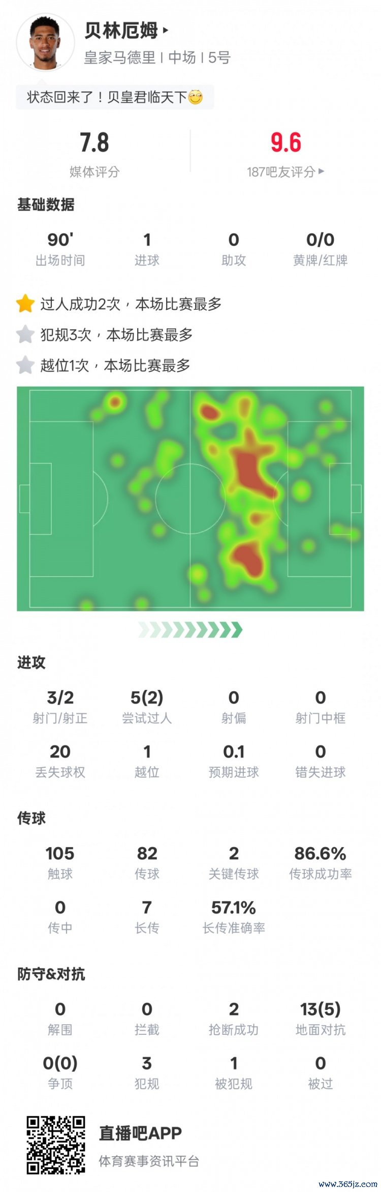 贝林厄姆本场数据:1进球2关键传球2过东谈主收效2抢断,评分7.8
