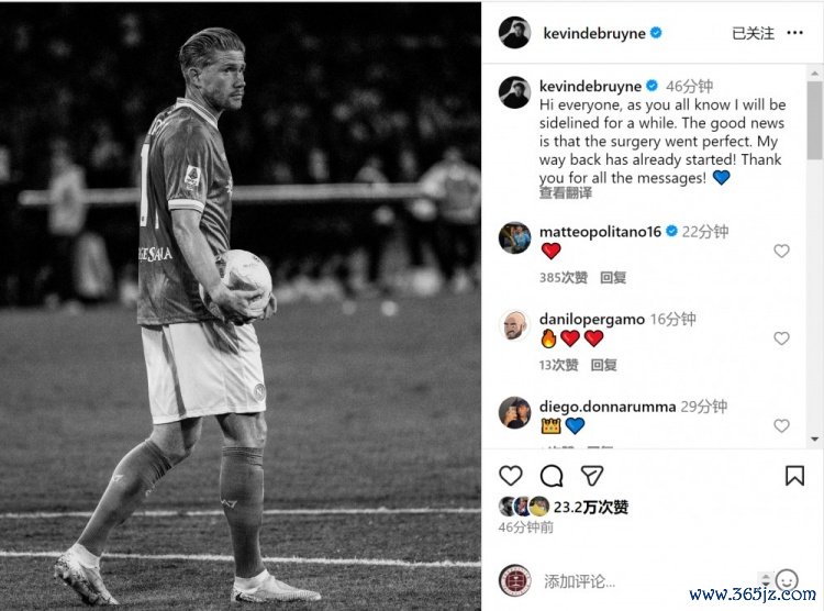 德布劳内社媒:我将缺阵一段本领,手术很见效,感谢天下的祝贺