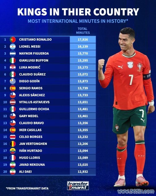 11月13日讯 德国转会阛阓列出了国度队出场技术排行,C罗居首,梅西次席。