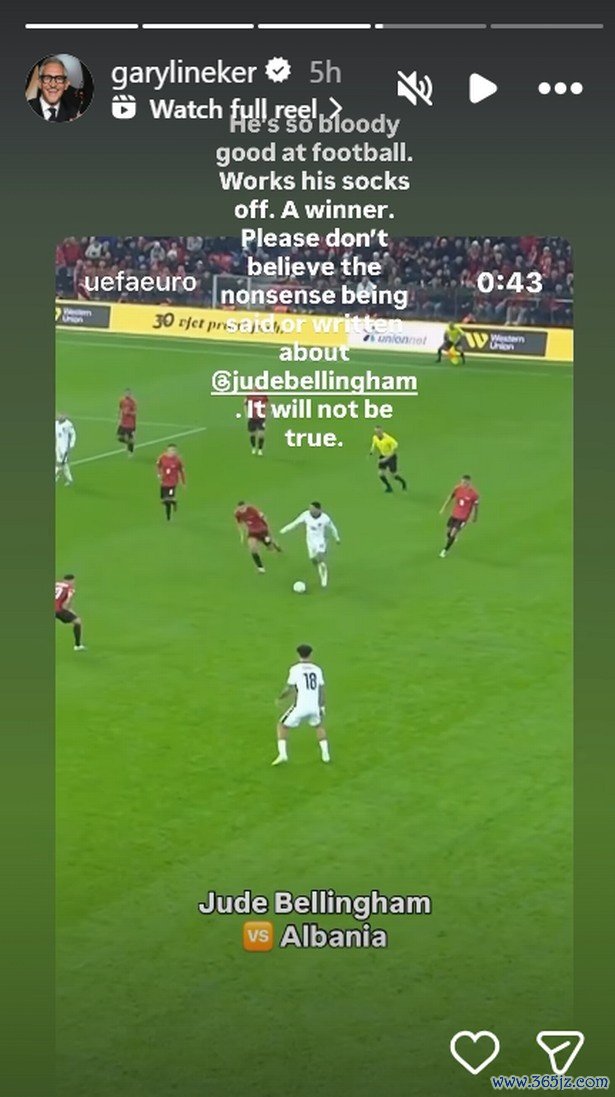 莱因克尔在他的Instagram故事均共享了欧足联官方欧洲杯账号展示的贝林厄姆对阵阿尔巴尼亚比赛精彩片断的帖子并写说念:"他在足球边界确凿太出色了。(在场上)拼尽全力。一个赢家。请别慑服那些对于@贝林厄姆的瞎掰八说念。那些齐不是的确。"