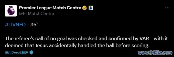 英超官方讲明这一判罚:裁判判罚进球无效,流程VAR裁判阐明,热苏斯进球前失慎用手触球。