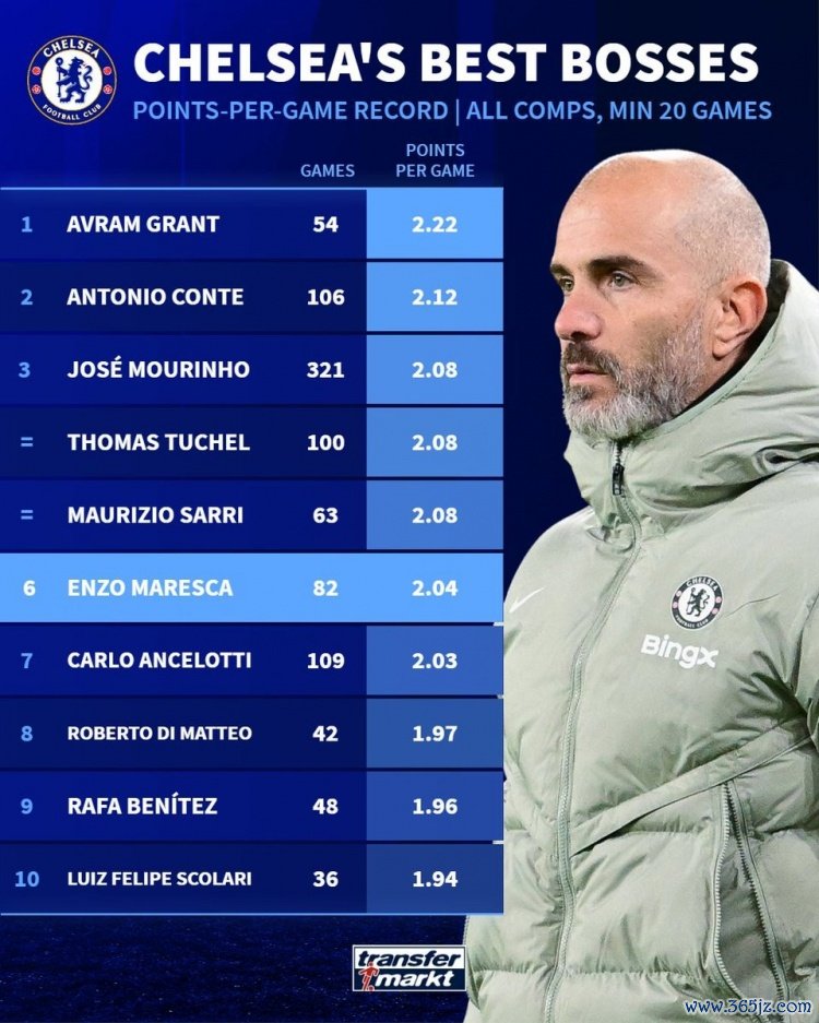 11月22日讯 切尔西在本轮英超2-0力克伯恩利,数据统计露馅马雷斯卡带队场均拿分已超过安切洛蒂,升至队史第6位。