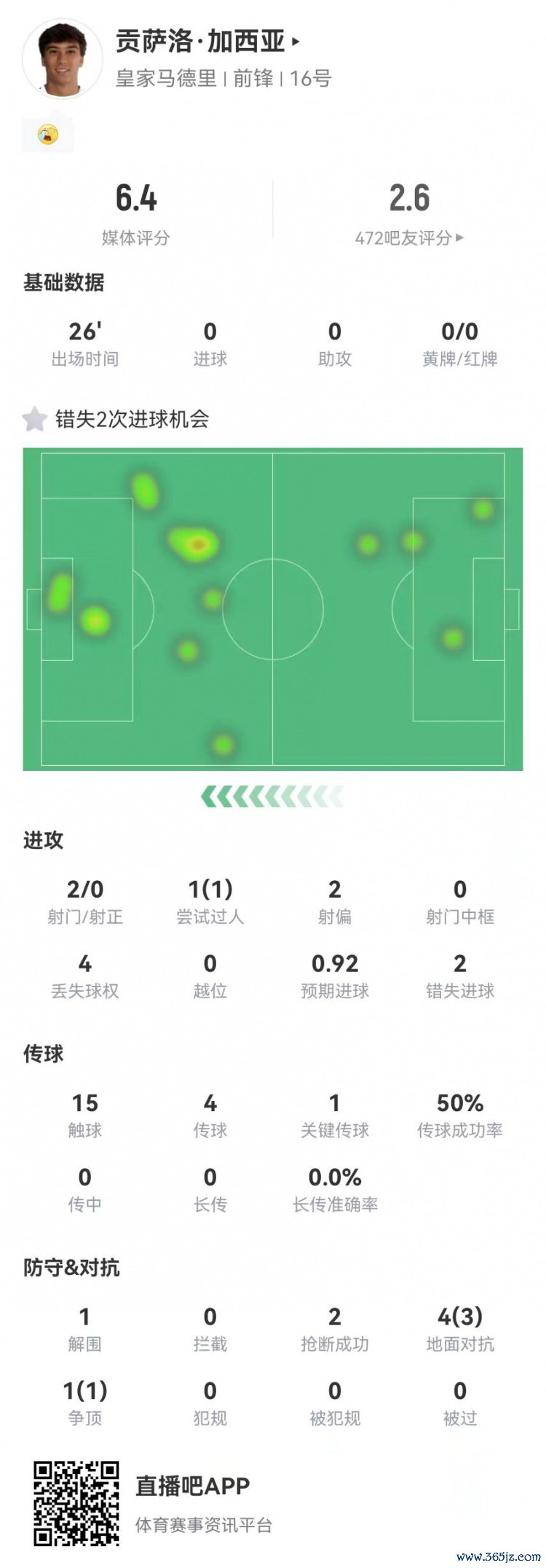11月24日讯 皇马在本轮西甲2-2战平埃尔切,贡萨洛·加西亚本场数据如下: