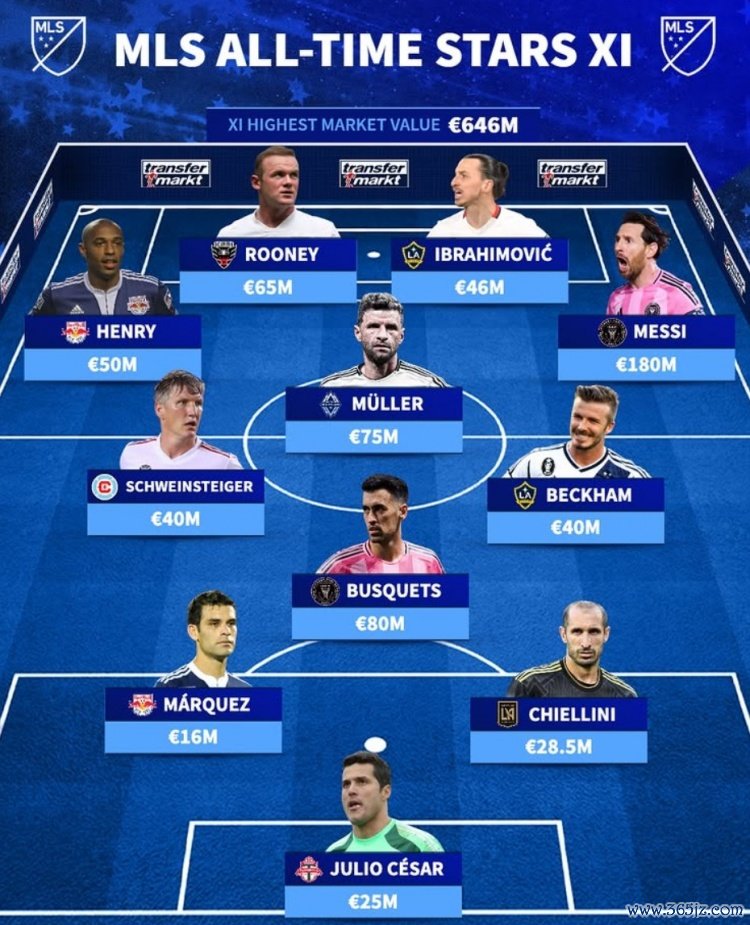 前卫:蒂埃里·亨利(纽约红牛,5000万)、韦恩·鲁尼(华盛顿特区联,6500万)、兹拉坦·伊布拉希莫维奇(洛杉矶星河,4600万)、梅西(迈阿密海外,1.8亿)