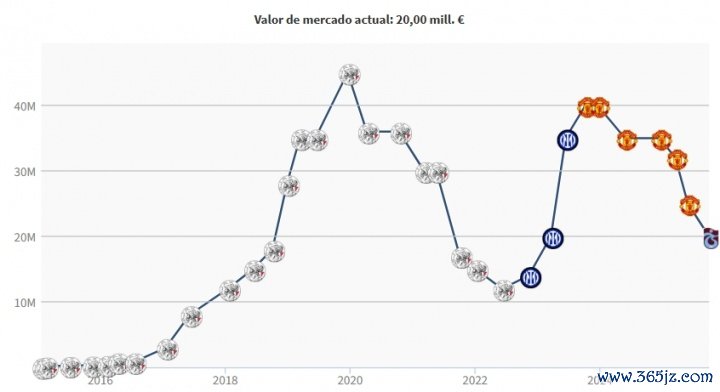 奥纳纳2023年夏窗以5000万欧元从国米转会曼联,那时他的身价为3500万欧元。加盟曼联后奥纳纳的身价涨至4000万欧元,而后屡次下落。