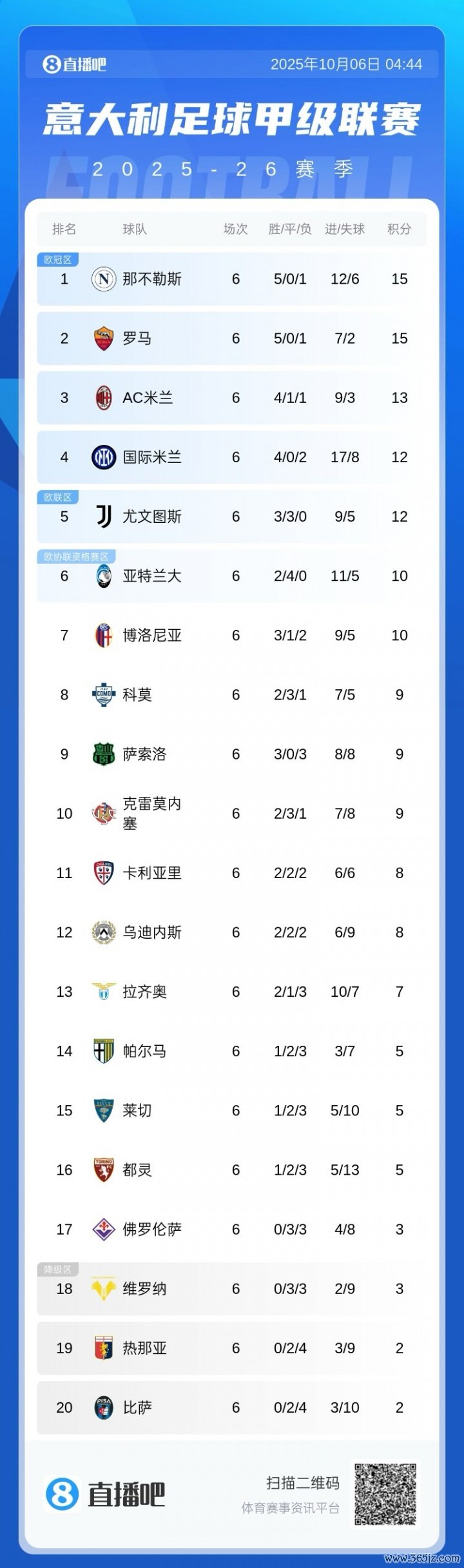 10月06日讯 意甲第6轮比赛一皆铁心,罗马客场2-1佛罗伦萨,那不勒斯2-1逆转热那亚,尤文0-0米兰两边合手手言和,最新积分榜如下: