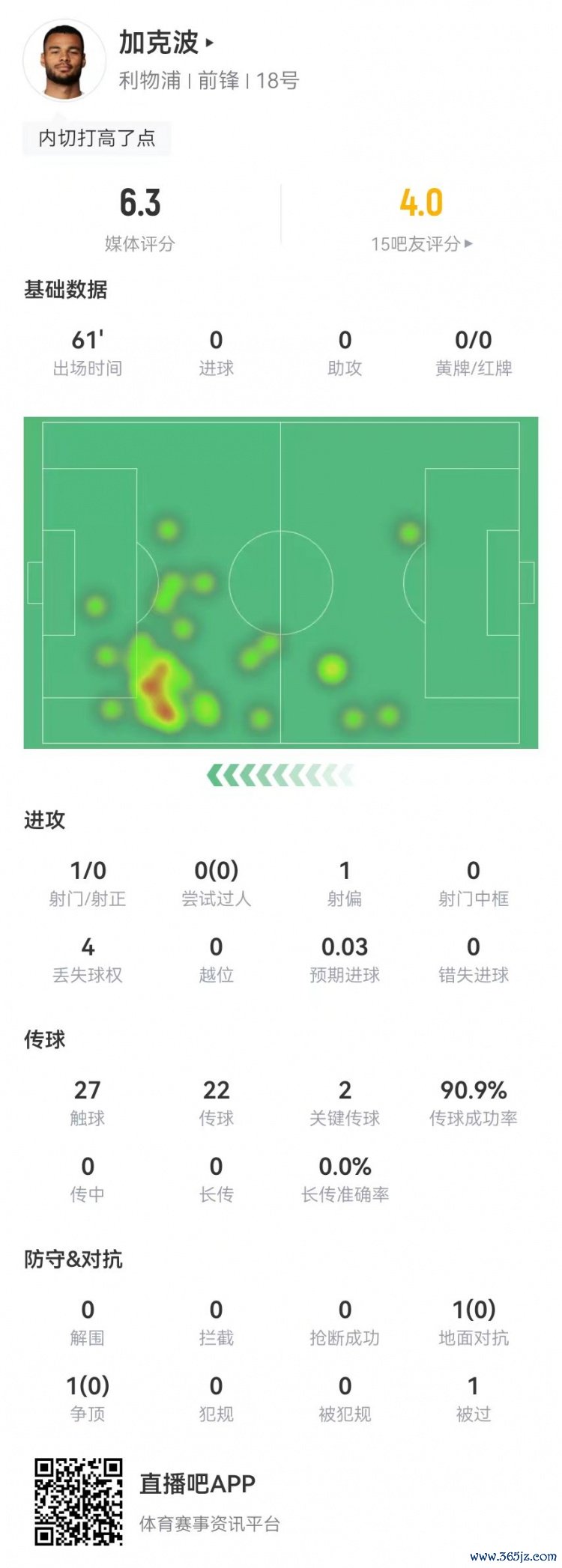 10月26日讯 利物浦在本轮英超对阵布伦特福德,加克波本场数据如下: