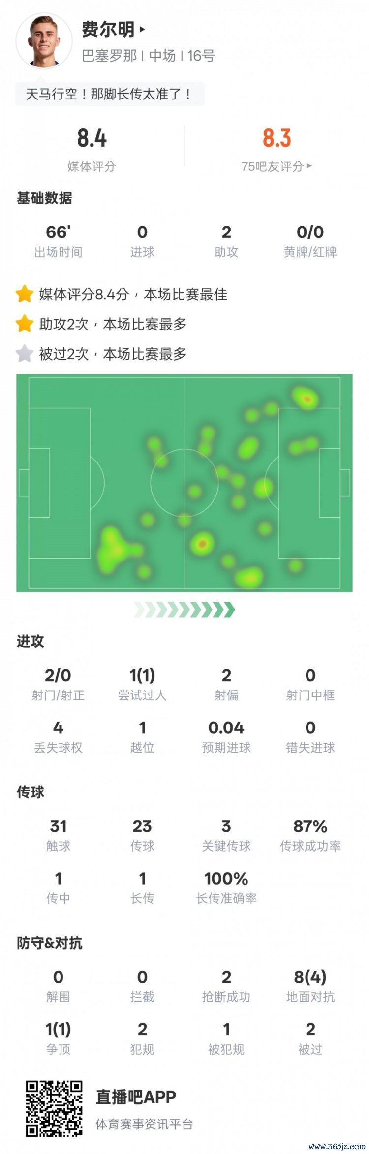 11月3日讯 2025-26赛季西甲联赛第11轮,巴萨3-1埃尔切。费尔明首发出战,送出2次助攻,1次过东说念主收效,还有3次要津传球,评分8.4全场最高。
