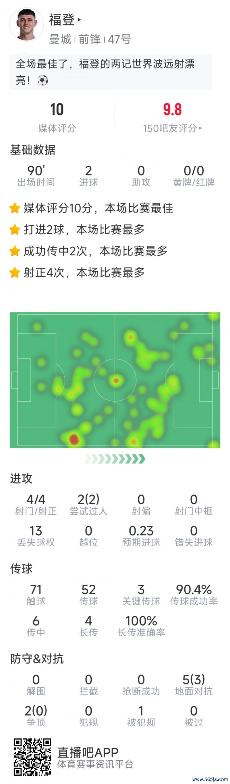 福登本场数据:梅开二度,4射4正,3次关节传球,评分10分