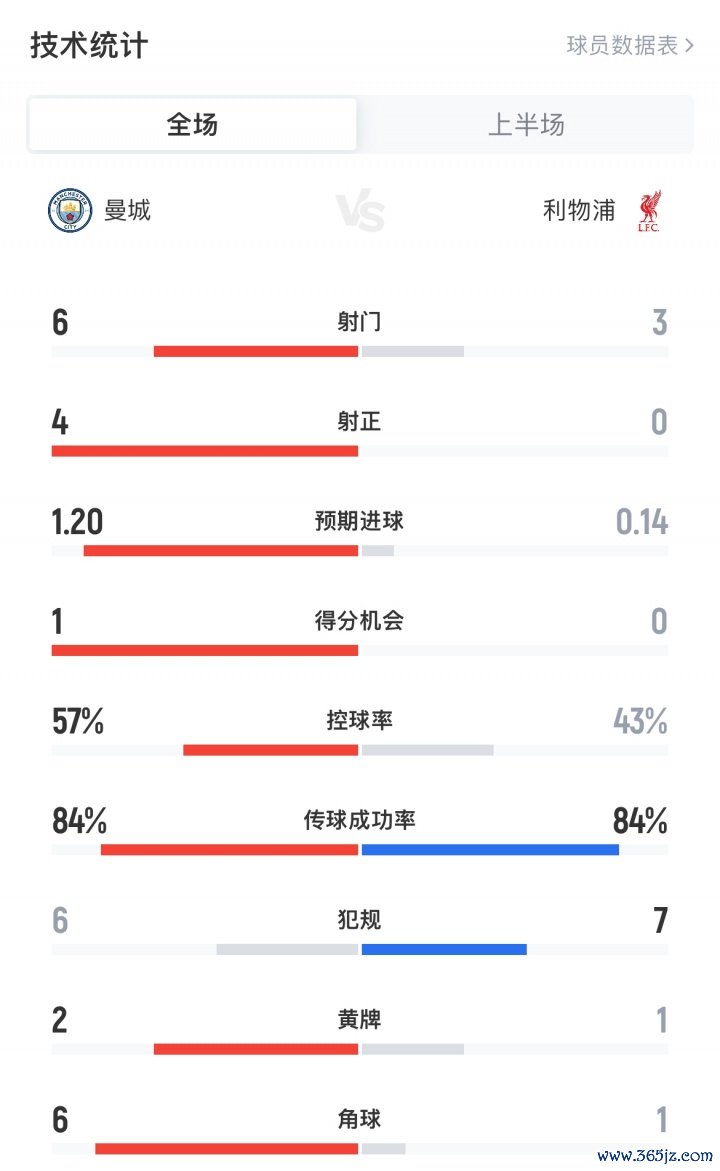 曼城vs利物浦半场:赤军3射0正,预期进球曼城1.2跳动赤军0.14