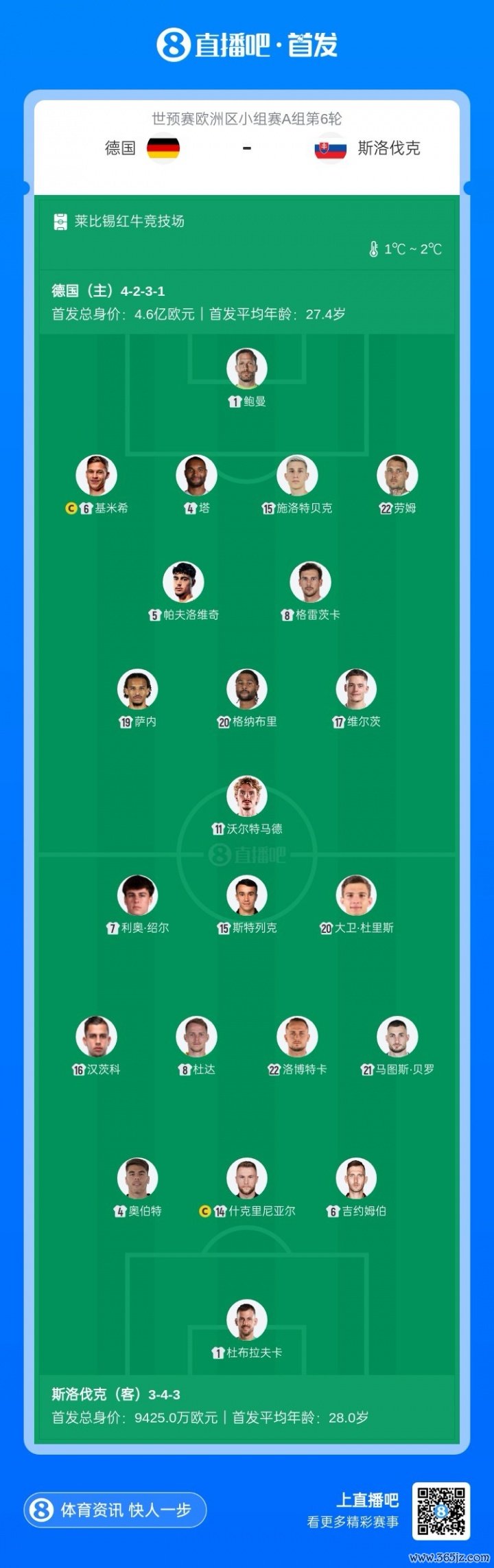 11月18日讯 世欧预A组第6轮,德国迎战斯洛伐克比赛行将打响,赛前首发出炉。本场是A组前二的末轮平直对话,两队本场赛前同分,将争夺头名。