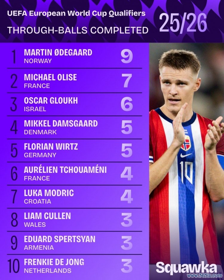 11月20日讯 本届世欧预小组赛一经告一段落,squakwa也统计了本届赛事直塞情况,厄德高领跑。