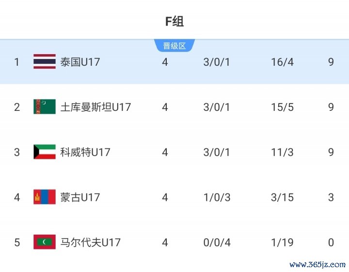 预选赛适度,泰国U16、土库曼斯坦U16和科威特U16同积9分,泰国U16最终凭借净胜球的上风晋级。