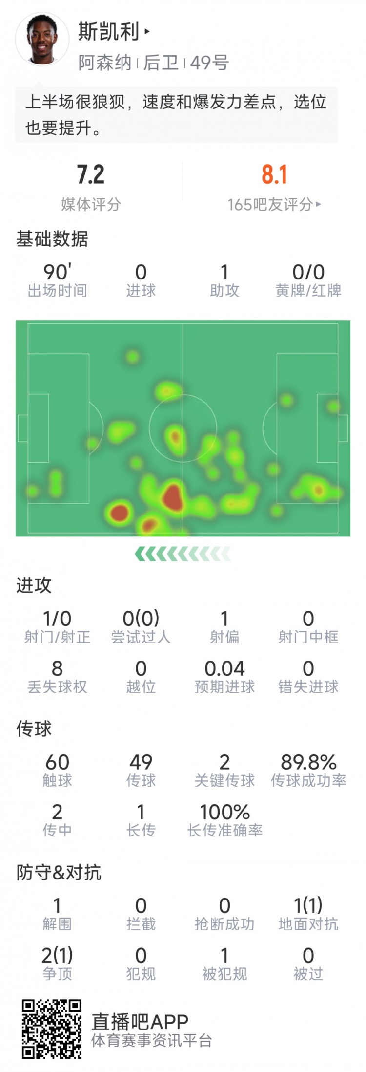12月11日讯 在本轮欧冠,阿森纳3-0打败布鲁日,以下为斯凯利在本场数据: