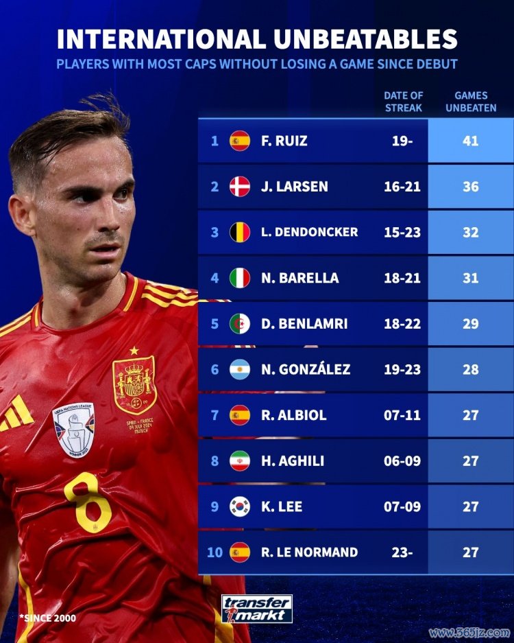 11月20日讯 德国转会市集统计了本世纪球员国度队首秀之后的协调不败场次数据,并排出榜单,法比安·鲁伊斯协调41场不败居首。