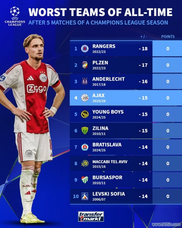 11月26日讯 阿贾克斯在本轮欧冠不敌本菲卡,连接了本赛季于今的灾祸发达,《转会商场》统计露馅他们亦然欧冠历史前5轮同时战绩比肩第4差。