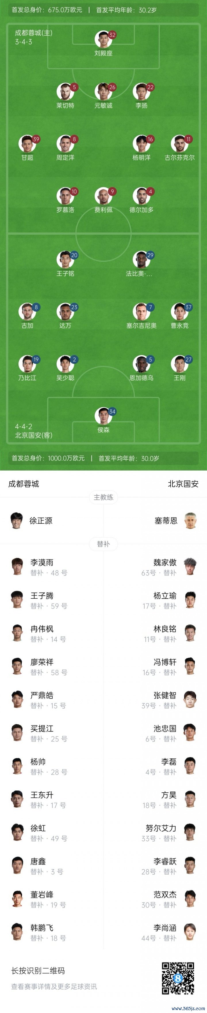 蓉城vs国安首发:4外助PK!德尔增多先发,王子铭、塞鸟出战