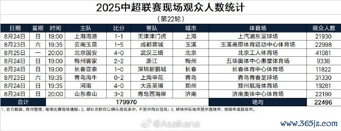 2025中超联赛现场不雅世东说念主数统计(第22轮)