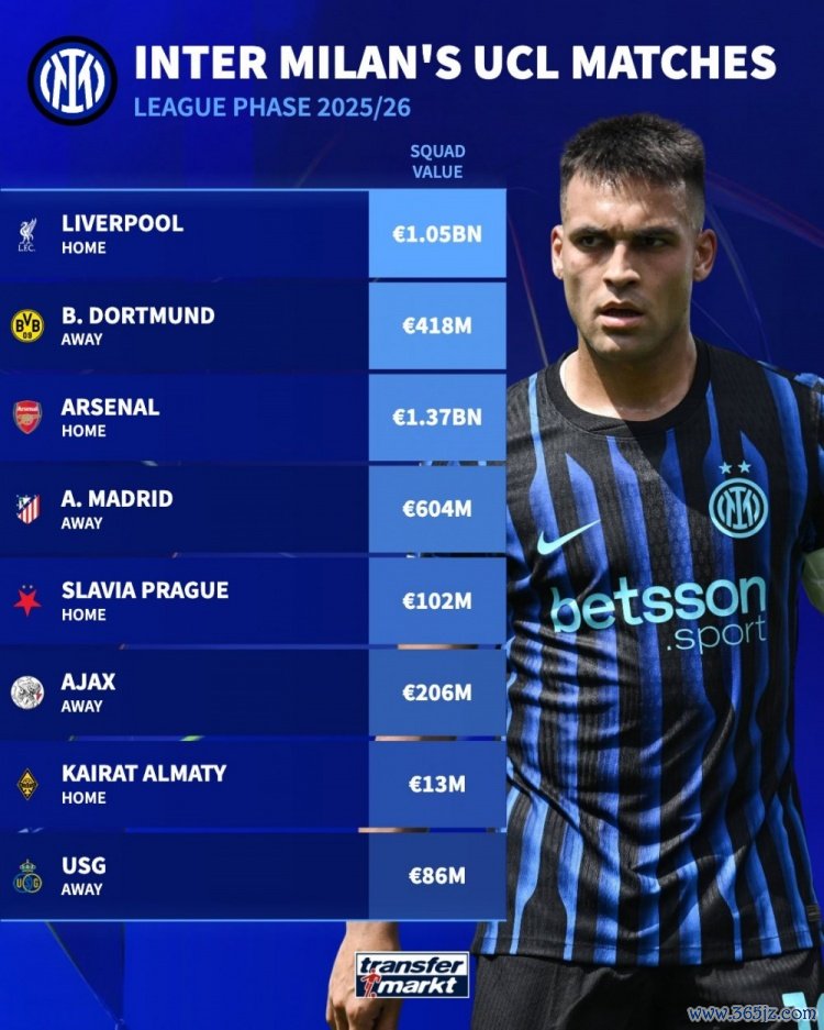 8月29日讯 本赛季欧冠联赛阶段对阵抽签遵守出炉,德国转会阛阓盘货了国米敌手的身价。