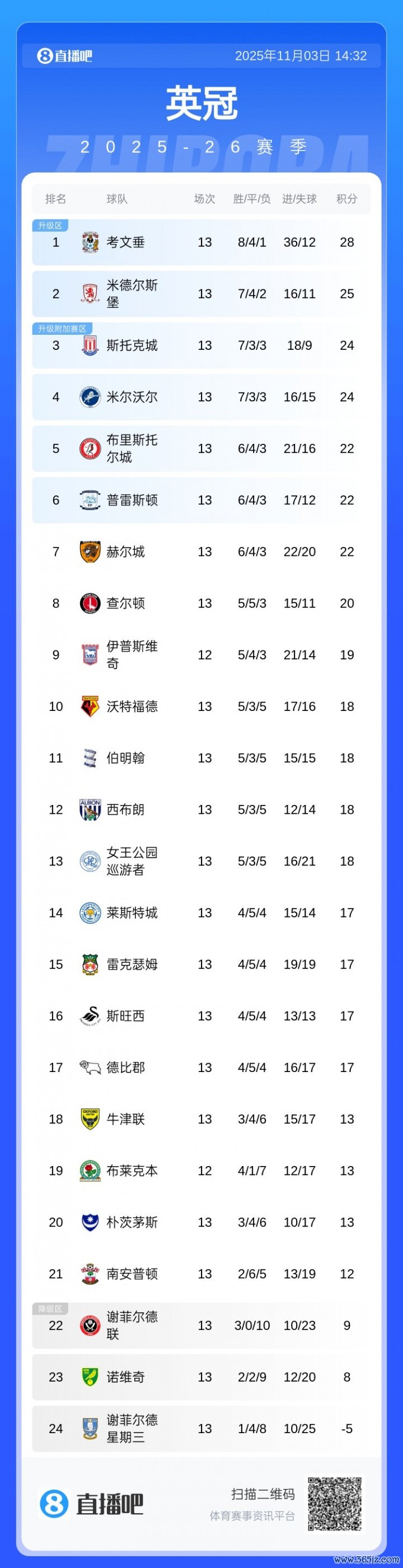 其他英冠球队方面,兰帕德抓教的考文垂本轮吃到英冠赛季首败,但仍以3分上风领跑。垫底的谢周三离抹平12分的罚分还有一些距离,现在暂积-5分。