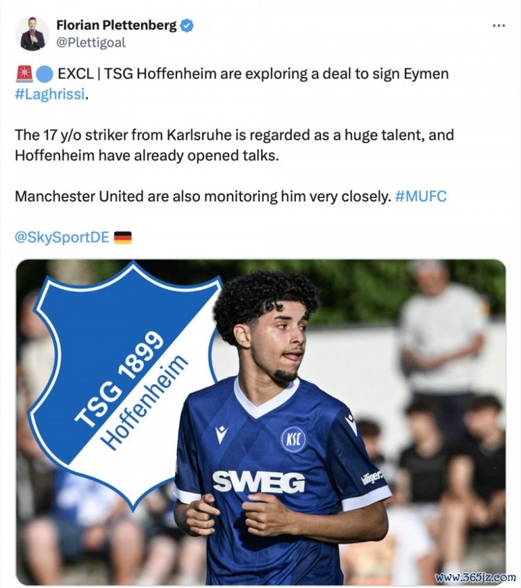 8月28日讯 据德国太空体育记者Florian Plettenberg音书称,霍芬海姆和曼联齐成心卡尔斯鲁厄17岁先锋拉格里西(Eymen Laghrissi)。