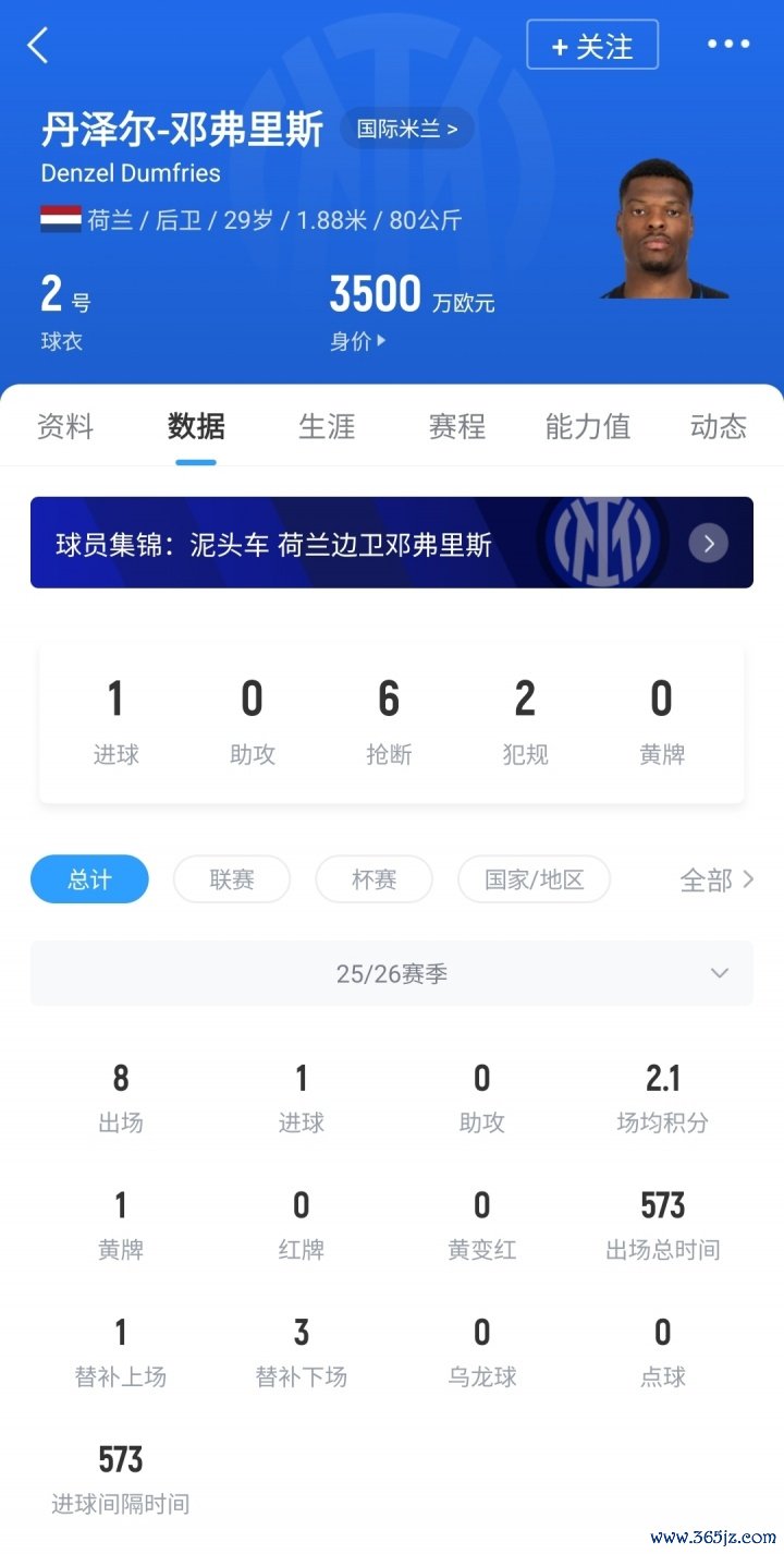 29岁的邓弗里斯本赛季代表国米出战8场比赛,打进1球,当今德回身价3500万欧。