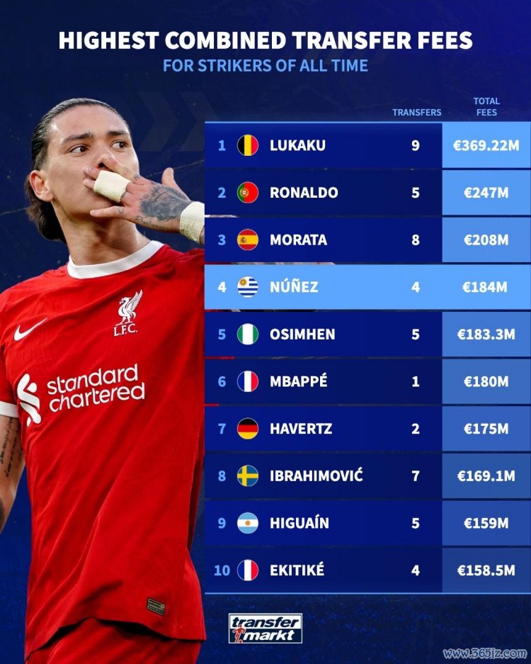 先锋累计转会费排行:卢卡库居首,C罗、莫拉塔、努涅斯前四