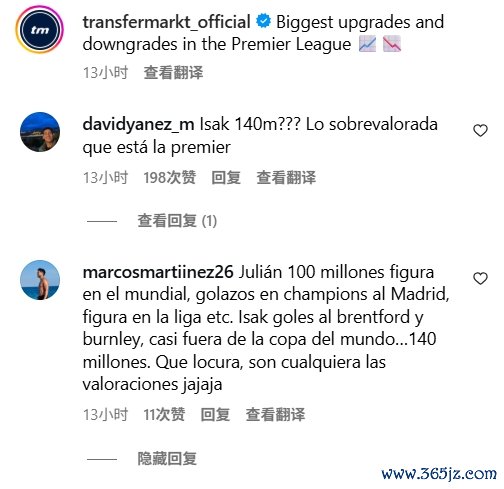 球迷B:“阿尔瓦雷斯辞天下杯上发达亮眼,欧冠踢皇马打入天下波,西甲联赛中亦然要道球员,咫尺身价1亿。伊萨克靠踢伯恩利和布伦特福德进球,差点进不了天下杯……身价是1.4亿。果然太猖獗了,这些身价果然破绽给的,哈哈哈哈。”