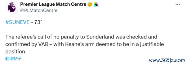 英超官方讲明注解:“裁判对桑德兰莫得点球的判罚经由了VAR的搜检和阐述,因为基恩的手臂被合计处于合理位置。”