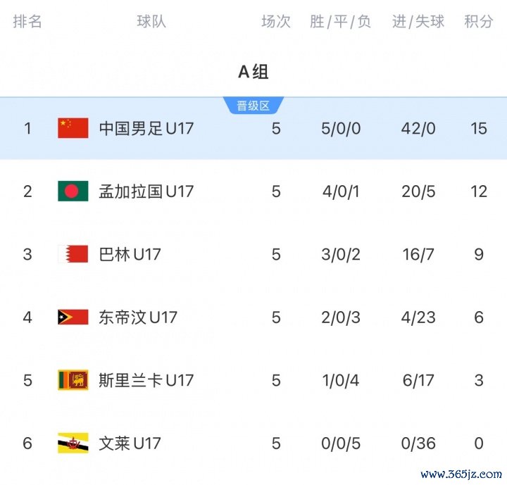 11月30日讯 本日U17亚初赛临了一轮,U16国足4-0治服孟加拉国,5轮全胜领跑积分榜,生效晋级来岁U17亚洲杯。最终积分榜如图。